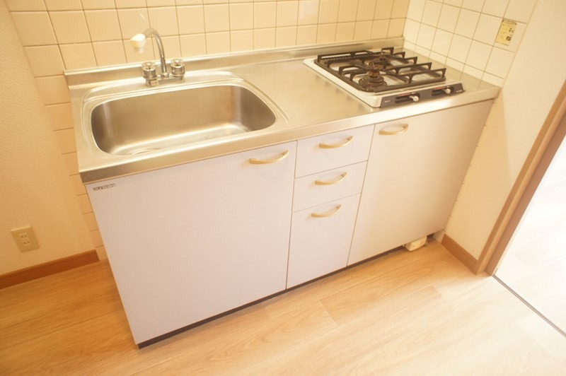 広々キッチンの単身物件。独立洗面台、室内洗濯機置き場有。