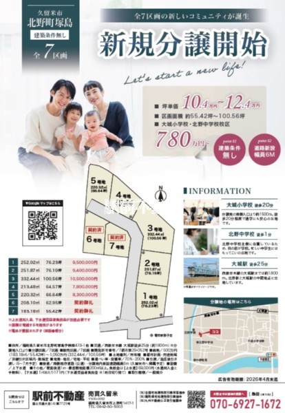 【建築条件なし:7区画開発分譲地】全区画60坪以上の広々分譲地です。残り5区画です。北野中学校目の前の立地です。直近の水害はございません。