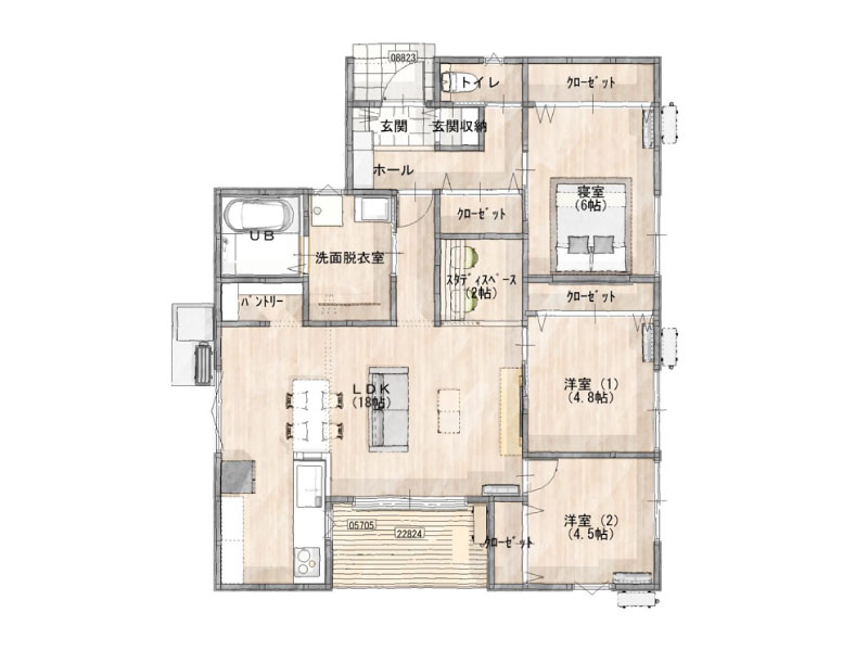 キッチンと横並びのダイニングやパントリー、広めの洗面脱衣所など、家事をラクにする工夫の詰まった間取りです。玄関・廊下・各居室に配置したたっぷりの収納も魅力。