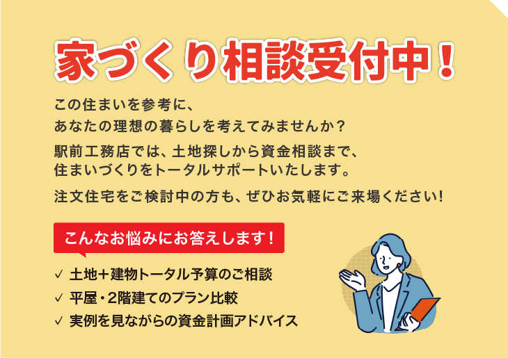 マイホームを検討中の方も、今後検討予定の方も、是非一度駅前工務店の住宅を見に来てください!