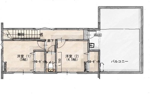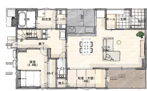 注目していただきたいのは、2Fの大きなルーフバルコニー!シンクも付いており、お子様の水遊びや、BBQなど、セカンドリビングとして楽しめる空間となっております。アイデアの詰まった間取りは、キッチン~パントリー~脱衣室へつながっており、家事ラクに。また、寝室は1Fなので、将来は1Fだけでも生活できる人生設計も楽しめます♪