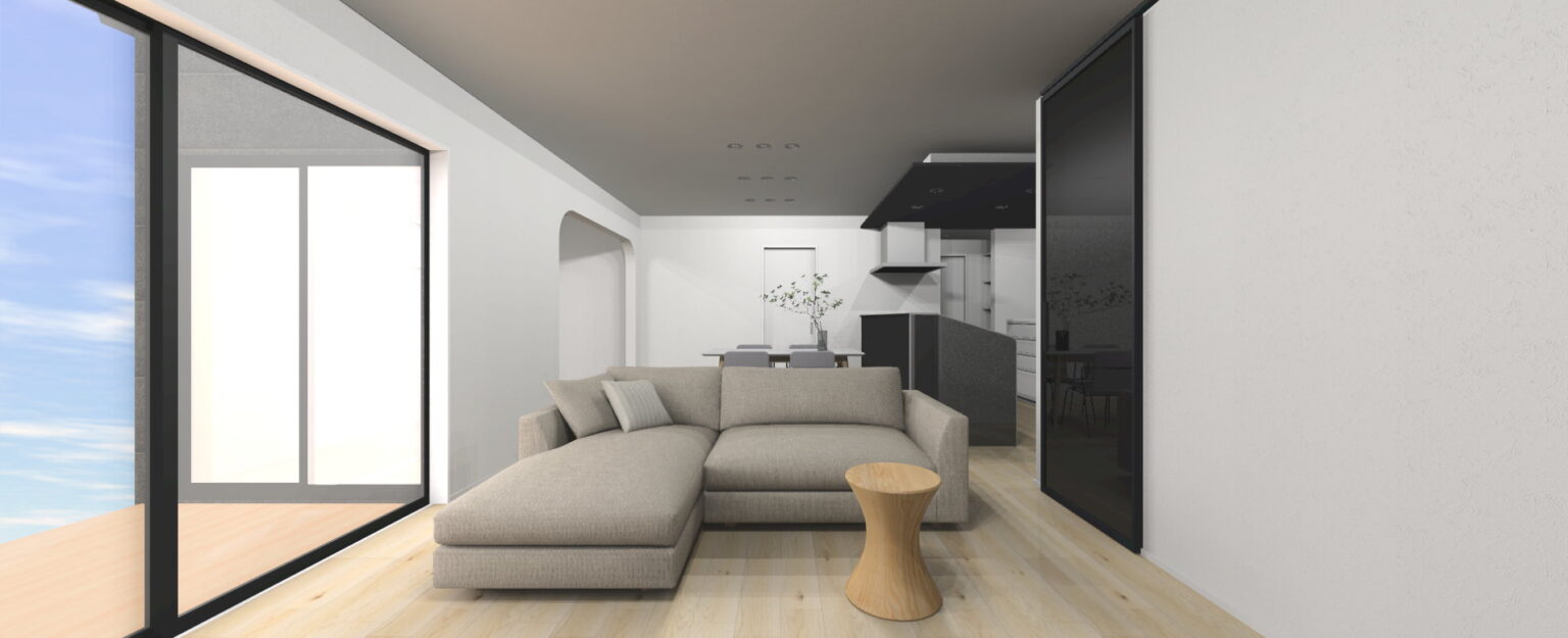 リビングは黒基調のシックなデザインに。リビングの奥に洋室や水回りがあるので、自然と家族が集まりやすいリビングです。