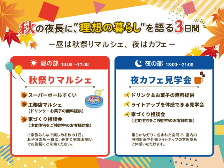 2025年11月22日(土)・23日(日)・24日(月・祝)に久留米市荒木町白口にて秋祭りマルシェ・夜カフェ見学会を開催いたします!腐らない緑の柱のハウスガードシステムを採用した住宅、しかも家具設置済み(ご契約でプレゼント)で暮らしをイメージしながら見学可能です♪WEB来場予約等で今ならAmazonギフト券をプレゼント中♪是非ご家族でお越しください!