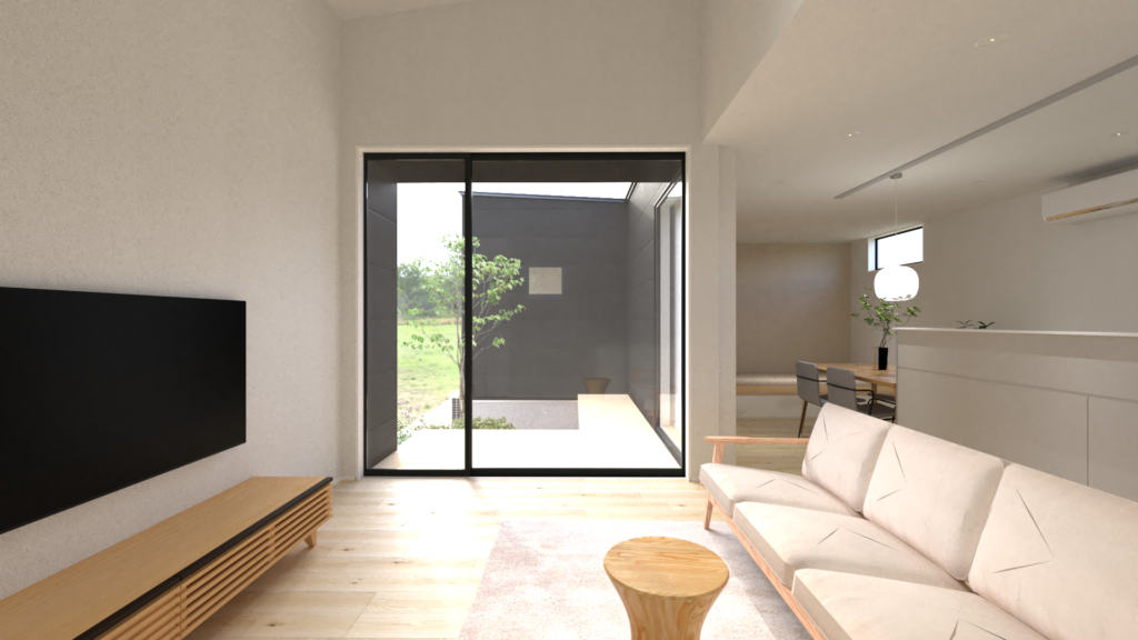 リビングに入ると、目の前には勾配天井と中庭が広がり、開放的で心地よい空間が迎えてくれます。さらに、リビングから南の庭へとつながる建具には天井までのサッシを採用しており、明るさと抜け感を最大限に感じられる設計です。リビングからまっすぐ庭へ視界が抜けることで、広がりとワクワク感あふれる住まいとなっています♪