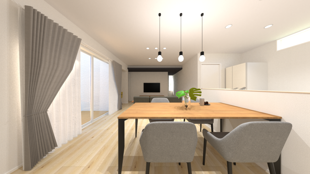 キッチン横に洗面脱衣室を配置する間取りは、複数の家事を同時に進めやすく家事ラクです!また、こちらの平屋は太陽光発電付きで光熱費もお得です!