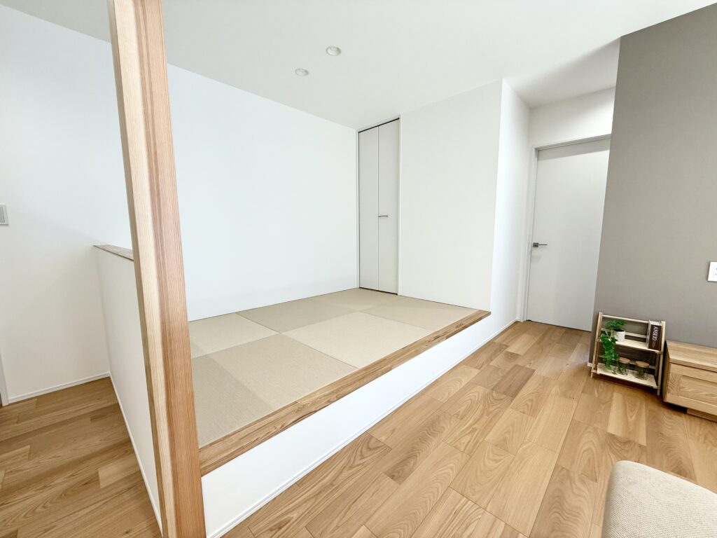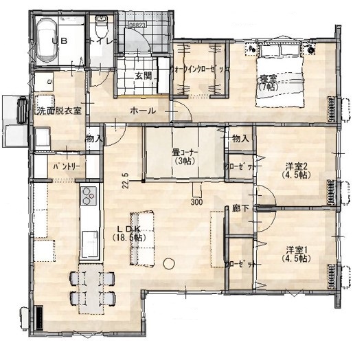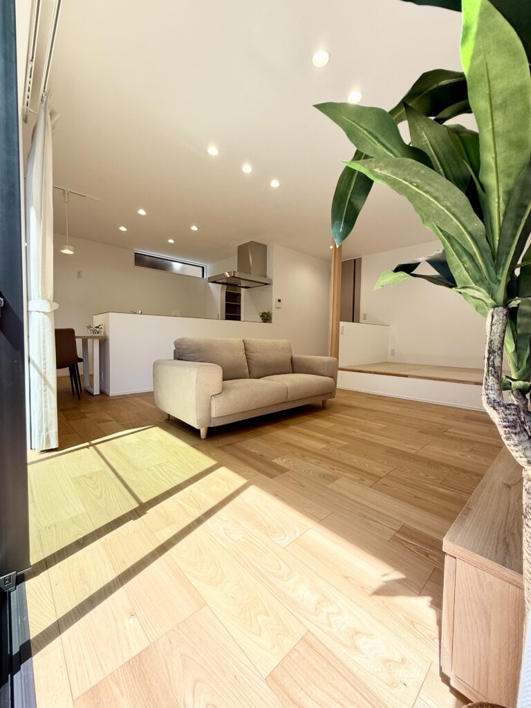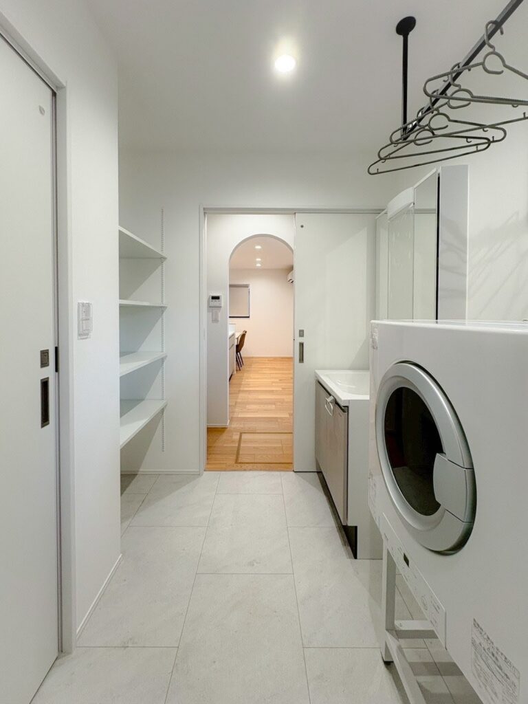 キッチン→パントリー→洗面脱衣室が繋がっていて、家事導線が楽になる間取りにしました。さらに注目して頂きたいのが、家事導線×乾太くんで、洗濯~乾燥までの時短を実現可能です。LDKはL型に窓を配置したことと、開放的な小上がり畳コーナーがあることで、明るさと広さを演出してくれます。