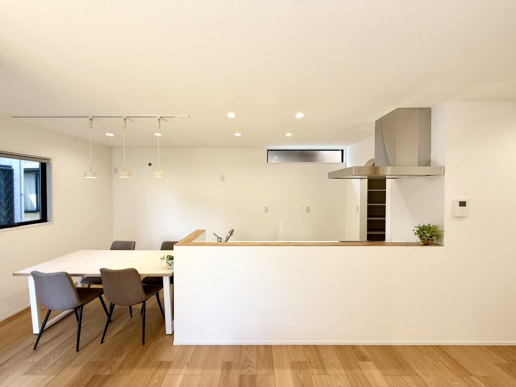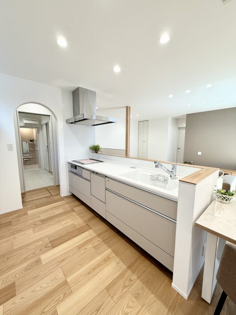 スマートレンジフードと腰壁で、すっきりとスタイリッシュなキッチン。お手入れしやすいIHクッキングヒーターと食洗機で、片付けも捗ります。