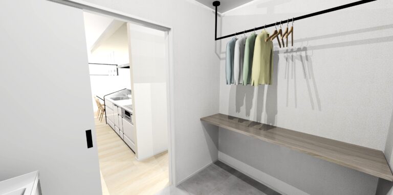 深みのあるネイビーのサイディングに木調の玄関の壁が映える外観です。LDKの物入はリビングで使うもの、ダイニングで使うもの、キッチン周りのものなどを一元的に収納し、散らかりがちな空間がスッキリ片付きやすいです。また、物入の隣に設置したスタディスペースは、お子様の勉強をキッチンから見守れます。洗面脱衣室にはカウンターとハンギングバーがあり、洗濯物を「洗う・干す・畳む」といった動線が1ヶ所で完結し、家事効率が向上します。電気自動車に使用できる「EVコンセント」付きの平屋です。