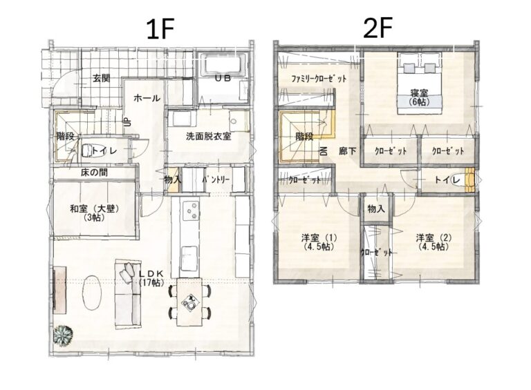 柔らかな色合いのシンプルモダンな外観です。LDKは木目クロスを貼った勾配天井で、開放感と温かみのある空間。「キッチン➡パントリー➡洗面脱衣室」の一直線の動線は、料理・洗濯・収納といった家事動線を効率化してくれます。2階には収納たっぷりのファミリークローゼットを設け、たくさんの荷物を収納可能です。