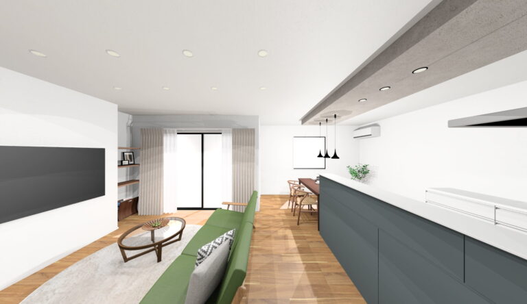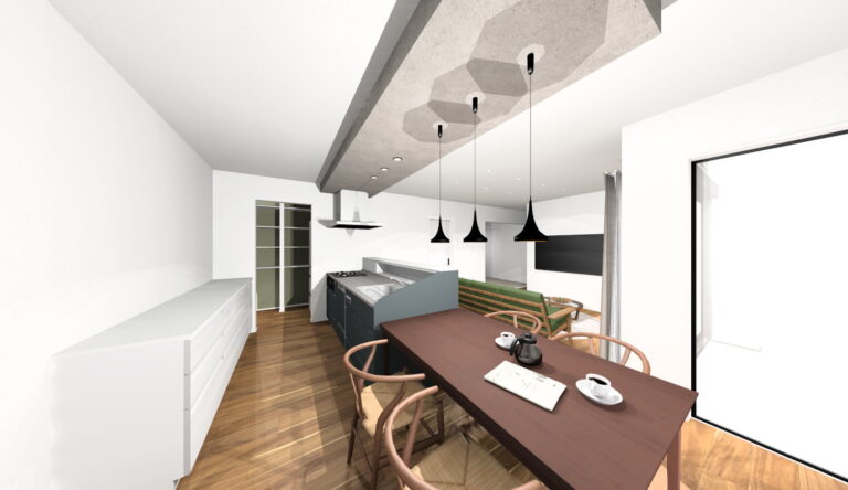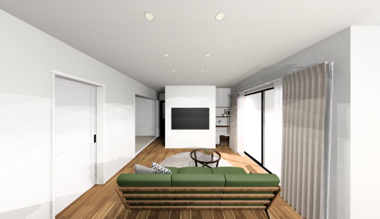 ブラックを基調に木目アクセントがかっこいい外観です。木目による濃淡のデザイン性が特徴のアカシヤの床が落ち着いたリビング空間を演出します。グレーの下がり天井が印象的なダイニングキッチンは、横並びの配置で家事動線もスムーズ。パントリーに冷蔵庫を隠せるほか、勝手口付きで利便性も良好です。テレビ横に飾り棚としても使えるオープン収納も設置しています。