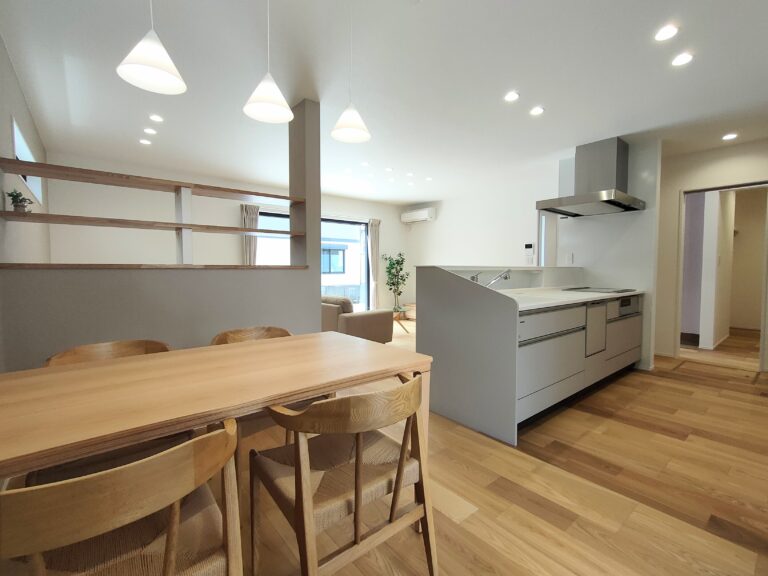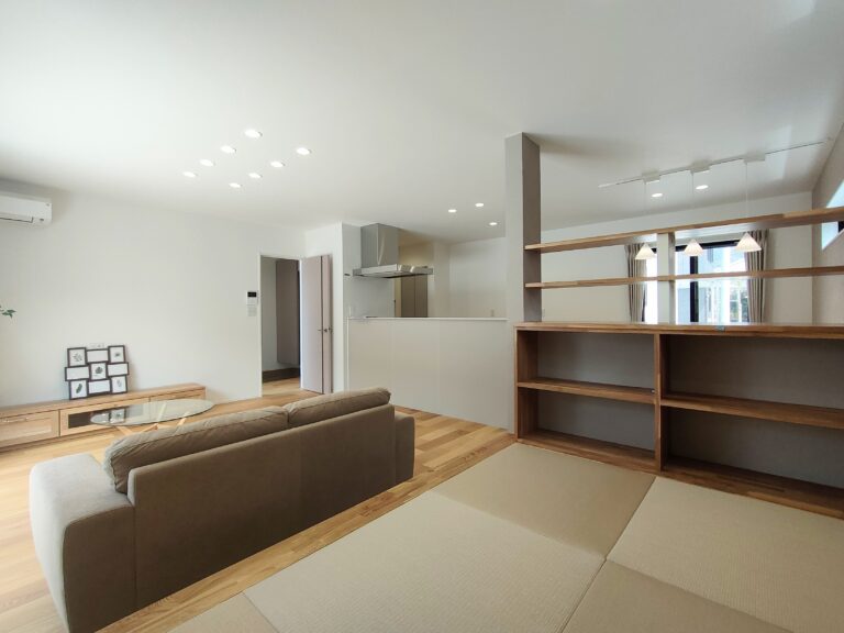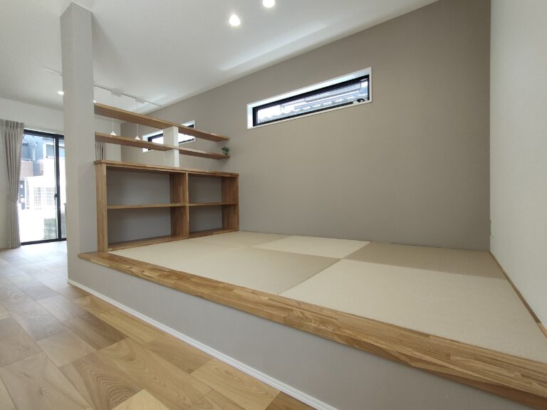 モダンな片流れ屋根が印象的なスタイリッシュな外観。棚付きの小上がり畳コーナーは、おしゃれで機能的な空間です。リビング近くのファミリークローゼットで家族の衣類をまとめて収納でき、片付けもスムーズ。広めの洗面カウンターは、使い勝手と収納力を両立させた設計が特徴です。また、太陽光発電システムを搭載しており、日々の光熱費を抑えられる経済的な住まいです。