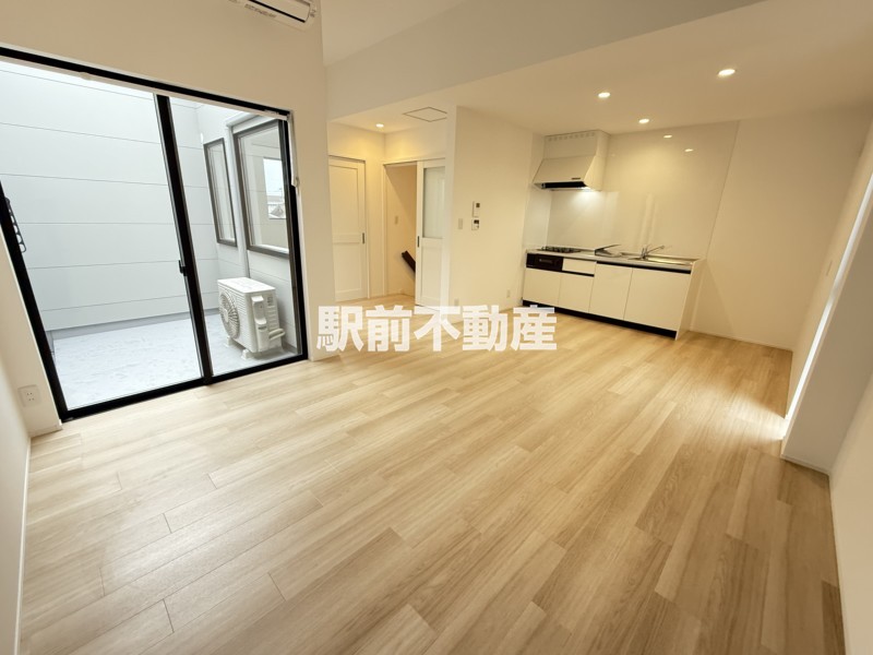 光庭から明るい太陽光が差し込むリビングです。キッチンが壁付けなので、その分スペースがあり、家具の配置がしやすいです。