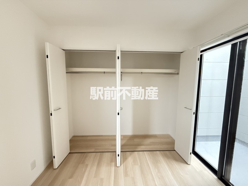 クローゼットは大きく開く扉で出し入れもスムーズ。ハンガーパイプで洋服をたくさん掛けられ、上部には季節物やバッグなども収納可能です。