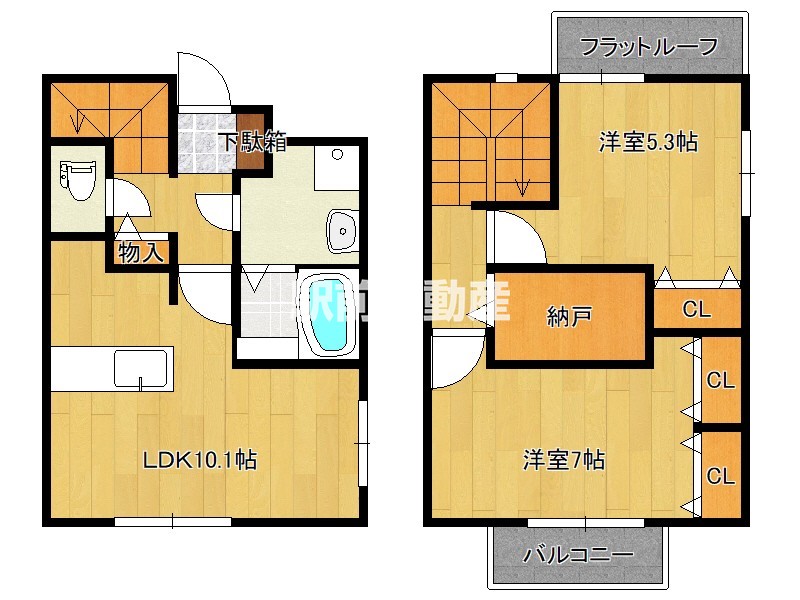 メゾネットタイプなので、上下階の音を気にせずに生活できます。1階は、水回りがまとまっており、家事や掃除がしやすい間取りです。2階は、各部屋にクローゼットと、納戸があるため、収納も充実しています。